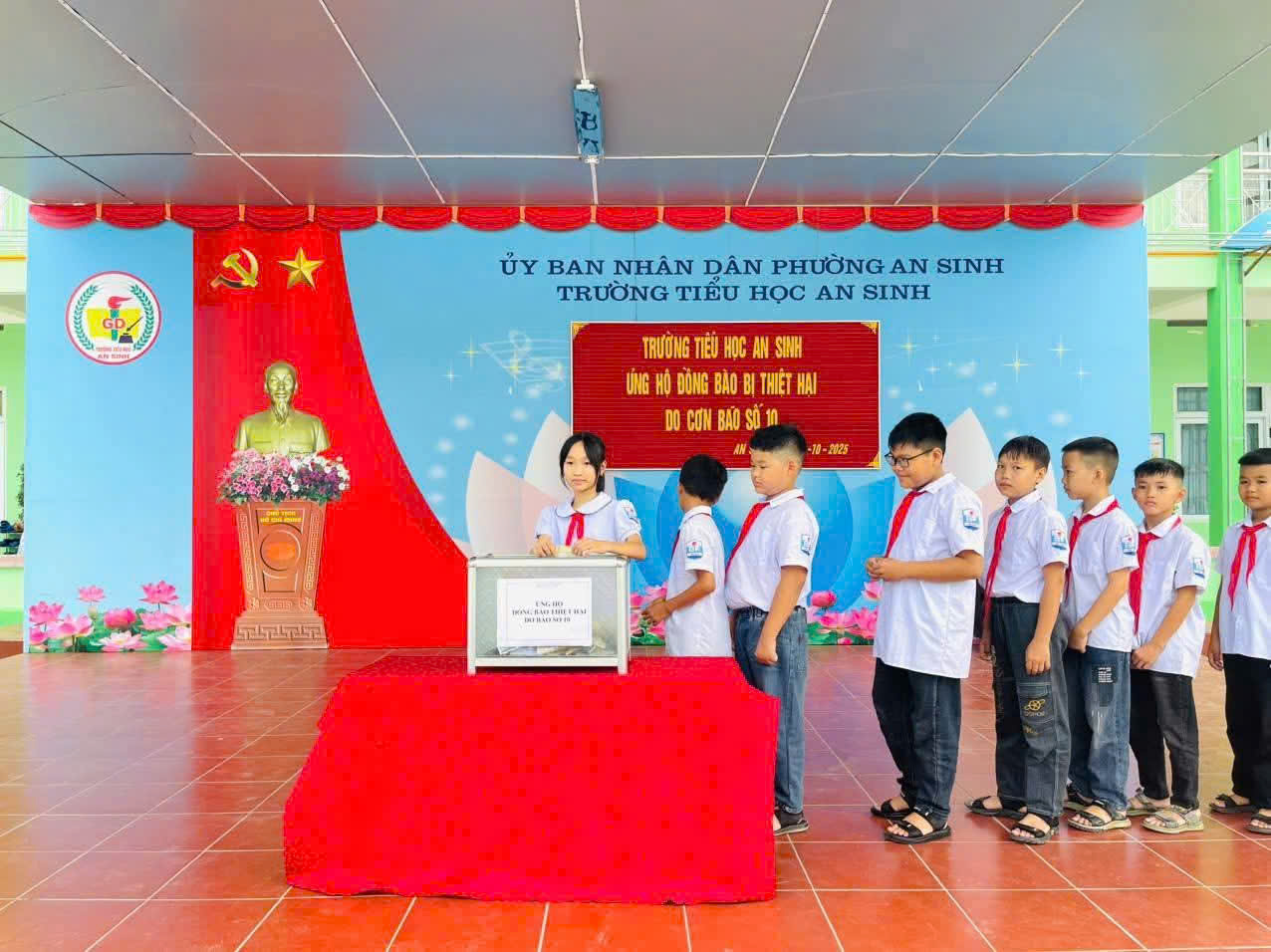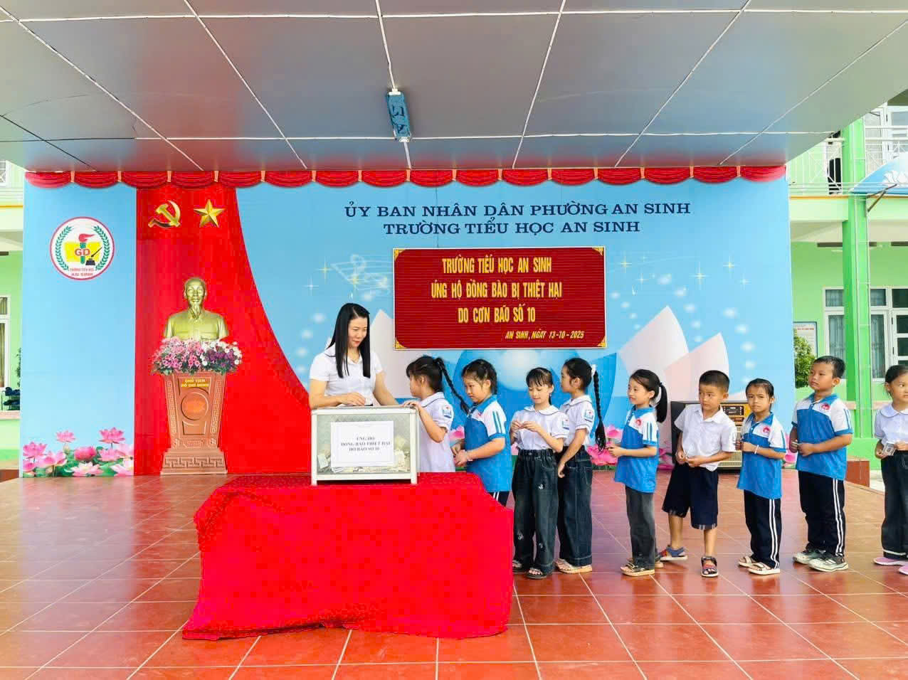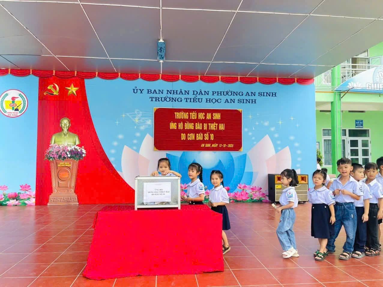 Hưởng ứng lời kêu gọi của Ủy ban Mặt trận Tổ quốc Việt Nam phường An Sinh về ủng hộ đồng bào khắc phục thiệt hại do cơn bão số 10 gây ra, với tinh thần "tương thân tương ái", "lá lành đùm lá rách", sáng ngày 13/10/2025, Trường tiểu học An Sinh tổ chức phát động quyên góp ủng hộ đồng bào khắc phục hậu quả do cơn bão số 10.Với tình cảm hướng về đồng bào miền Trung và đồng bào các tỉnh phía bắc đang chịu ảnh hưởng nặng nề của thiên tai, nhà trường đã kêu gọi mỗi cán bộ, giáo viên, nhân viên, người lao động và toàn thể các em học sinh trong nhà trường quyên góp ủng hộ với tinh thần "nhường cơm sẻ áo", "lá lành, đùm lá rách". Tổng số tiền quyên góp là 12.098.000 đồng (trong đó CBGVNV là 7.562.000 đồng; học sinh: 4.536.000 đồng), số tiền được nhà trưởng chuyển về Ủy ban Mặt trận Tổ quốc Việt Nam phường An Sinh ngay trong ngày 13/10/2025 nhằm kịp thời hỗ trợ đồng bào khắc phục bão lũ.
