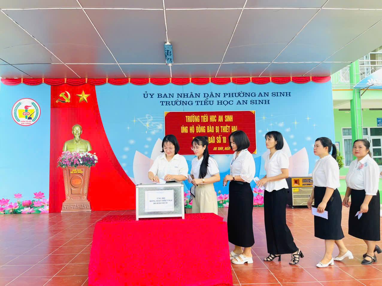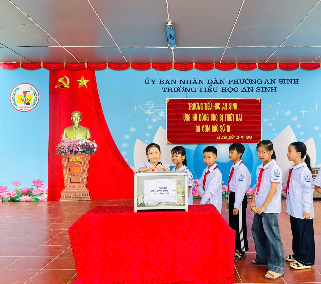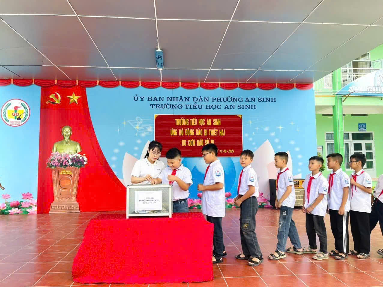 Hưởng ứng lời kêu gọi của Ủy ban Mặt trận Tổ quốc Việt Nam phường An Sinh về ủng hộ đồng bào khắc phục thiệt hại do cơn bão số 10 gây ra, với tinh thần "tương thân tương ái", "lá lành đùm lá rách", sáng ngày 13/10/2025, Trường tiểu học An Sinh tổ chức phát động quyên góp ủng hộ đồng bào khắc phục hậu quả do cơn bão số 10.Với tình cảm hướng về đồng bào miền Trung và đồng bào các tỉnh phía bắc đang chịu ảnh hưởng nặng nề của thiên tai, nhà trường đã kêu gọi mỗi cán bộ, giáo viên, nhân viên, người lao động và toàn thể các em học sinh trong nhà trường quyên góp ủng hộ với tinh thần "nhường cơm sẻ áo", "lá lành, đùm lá rách". Tổng số tiền quyên góp là 12.098.000 đồng (trong đó CBGVNV là 7.562.000 đồng; học sinh: 4.536.000 đồng), số tiền được nhà trưởng chuyển về Ủy ban Mặt trận Tổ quốc Việt Nam phường An Sinh ngay trong ngày 13/10/2025 nhằm kịp thời hỗ trợ đồng bào khắc phục bão lũ.